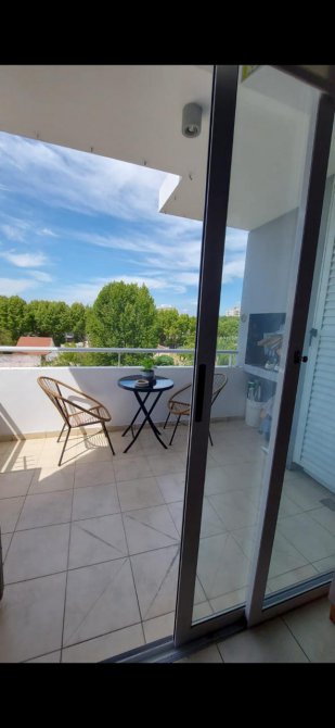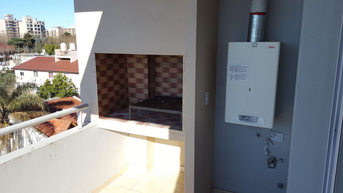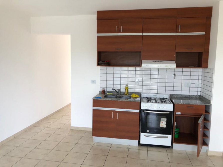 Cocina comedor con piso cerámico, muebles de bajo mesada y alacena, ventana balcón con doble vidrio (DVH) comunica a amplio balcón con parrilla individual.