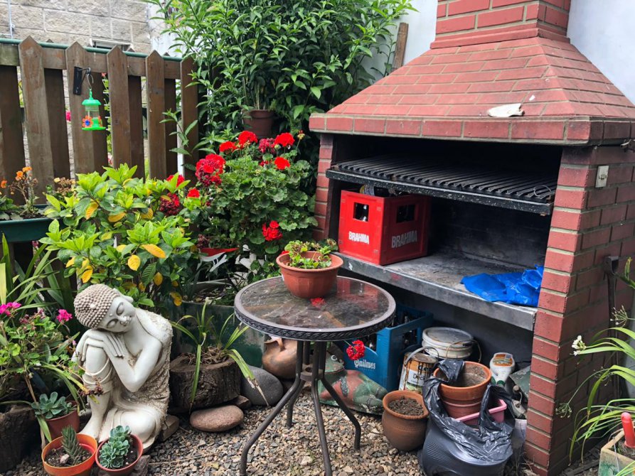 Patio chico con un pequeño techo de policarbonato con parrilla, todo cercado.