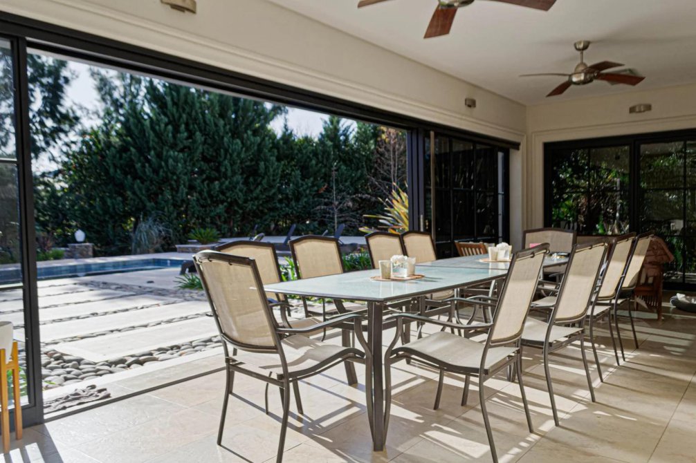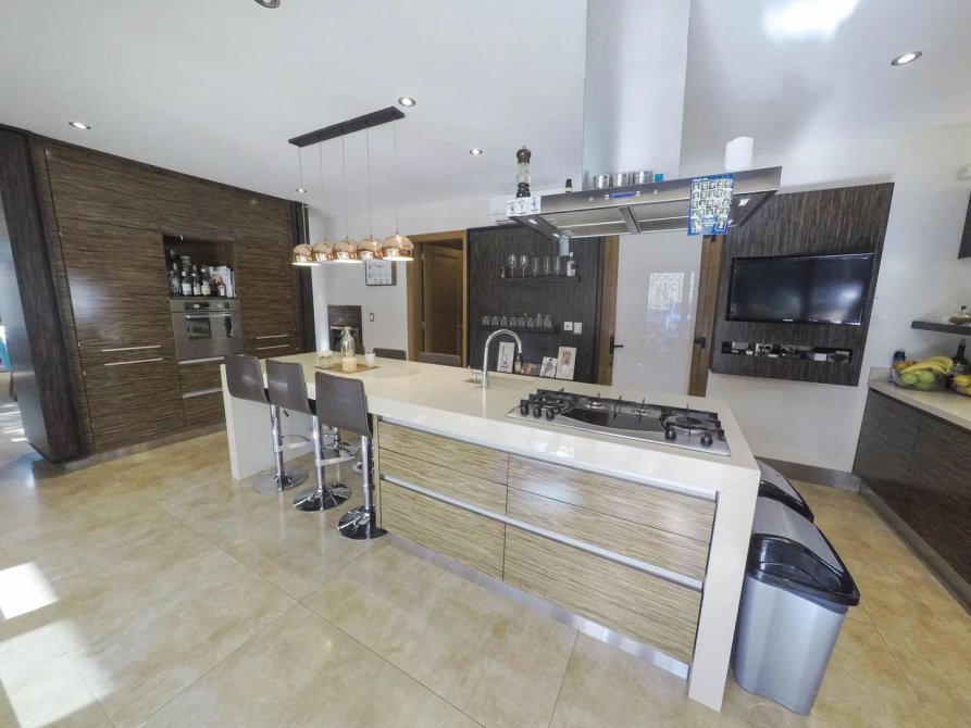 La cocina se encuentra separada y totalmente equipada donde apreciamos las vista al espacio semicubierto, parque y piscina.