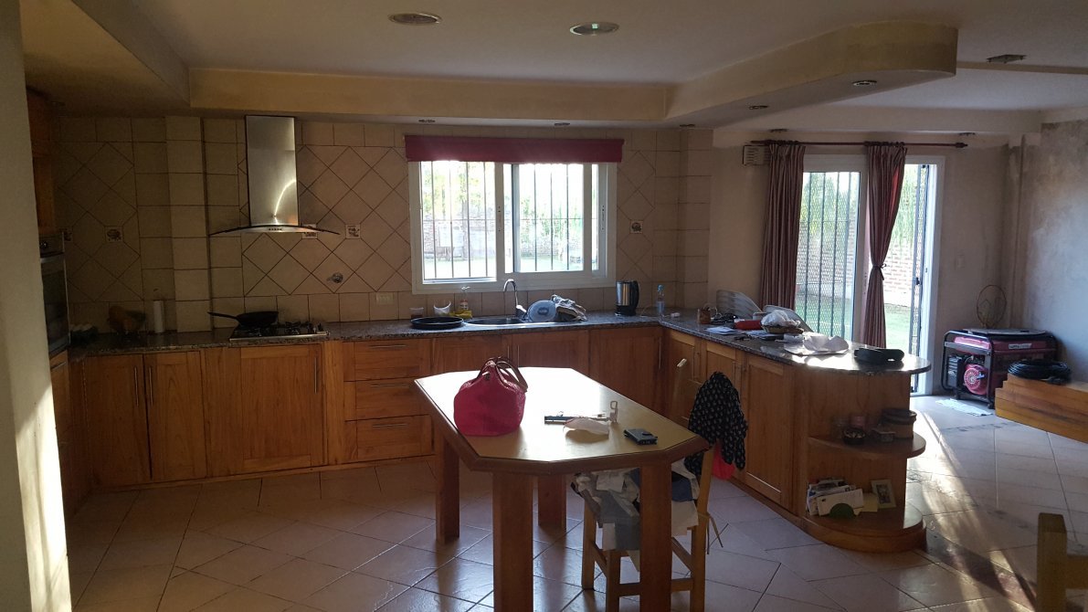 Cocina comedor muy amplio con amoblamientos en madera, horno y anafe; ventana balcon que comunica al fondo.