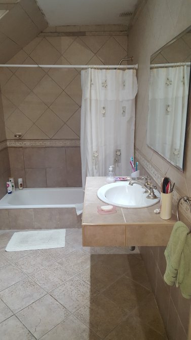 Baño completo: mesada con bacha, sanitarios, y bañera todo con revestimiento cerámico