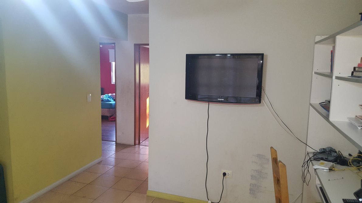Estar con piso ceramico; ventana balcon con vidrios repartidos en madera