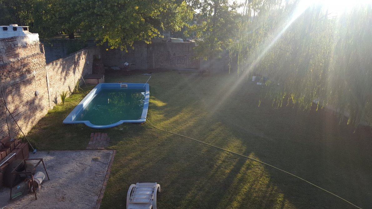 Fondo libre con pileta de fibra de 8.50 por 3.50 metros con sistema de filtro.
