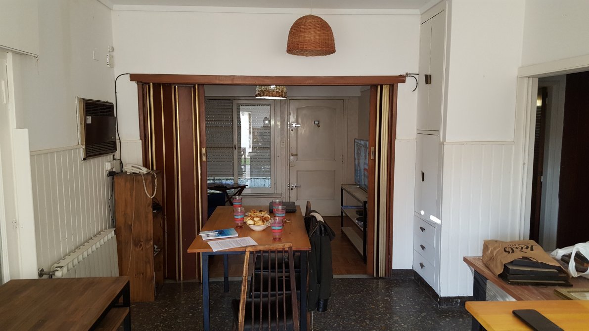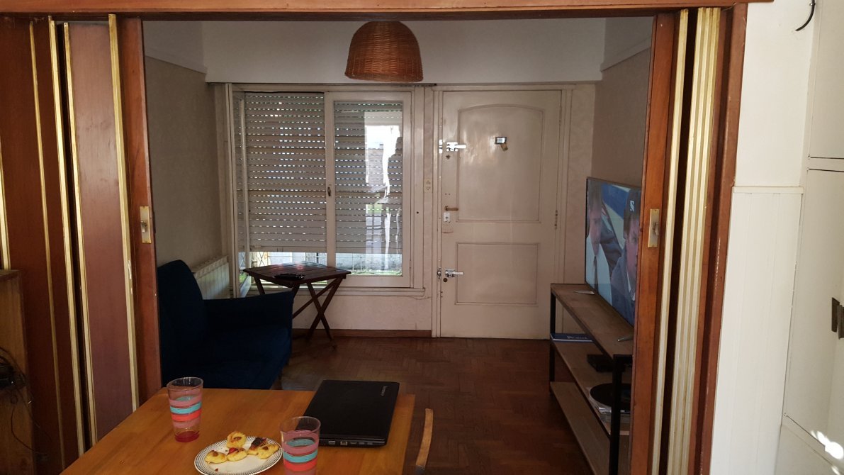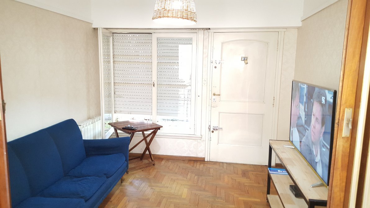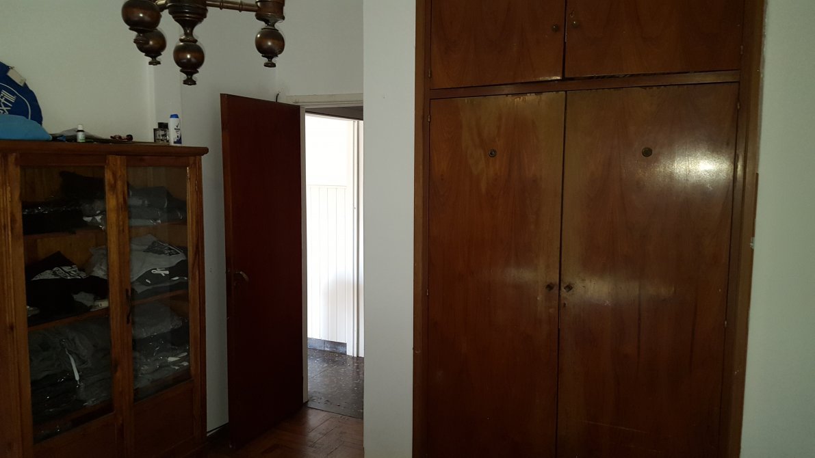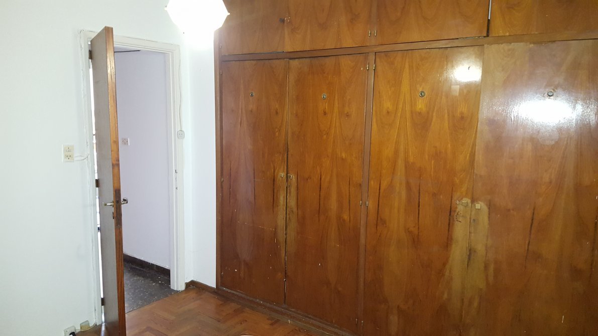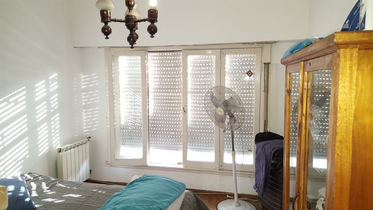 Dormitorio al frente, piso de parquet, ventana en madera con persiana y rejas, placard.