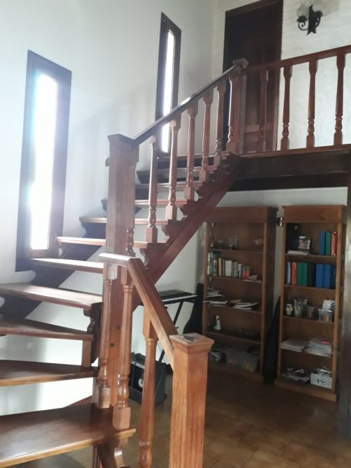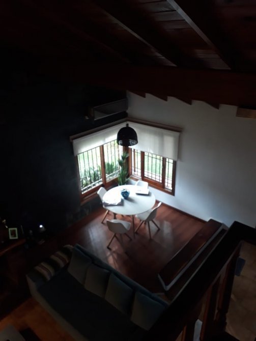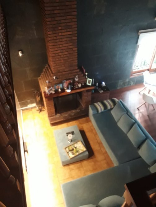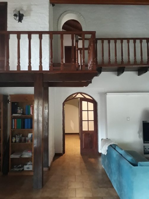 PB: Ingreso por un living con acceso a planta alta por una escalera en cedro con barandas torneadas, balconeado, piso ceramico, hogar a leña en ladrillo rasado, detalles en madera.
