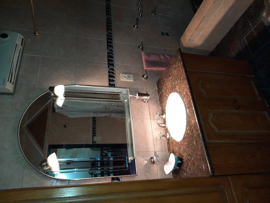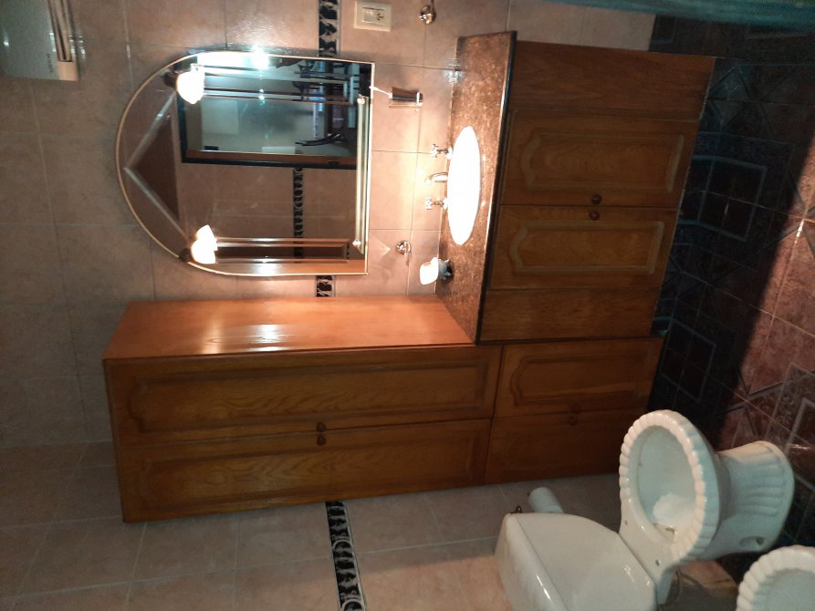 Baño con revestimiento cerámico, vanitory en madera, sanitarios y receptáculo de ducha.-
