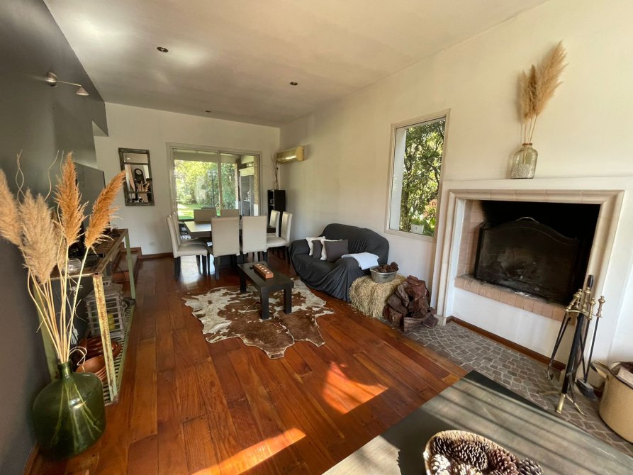 Living-comedor con hogar a leña, vista al frente y parque a través de amplias ventanas.-