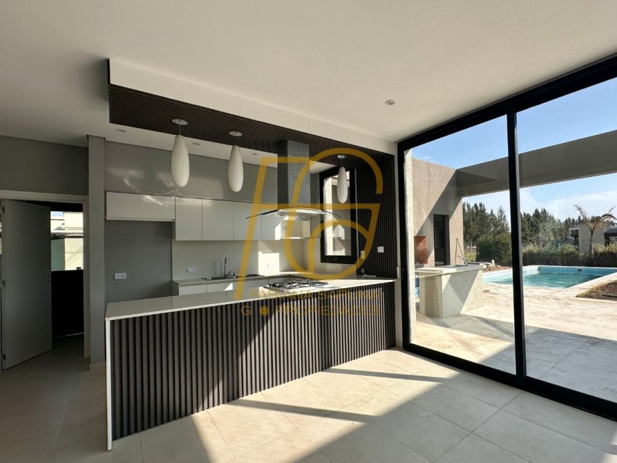 En el exterior dispone de una amplia galería con parrilla e isla; toilette; piscina revestida en venecitas; cochera cubierta para dos vehículos y espacio para dos mas.