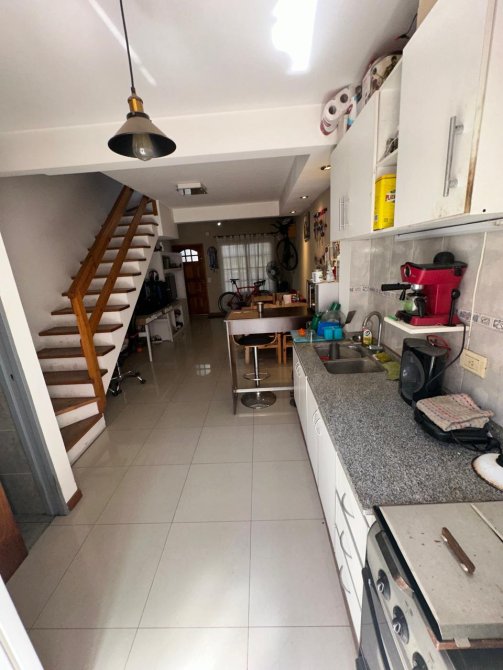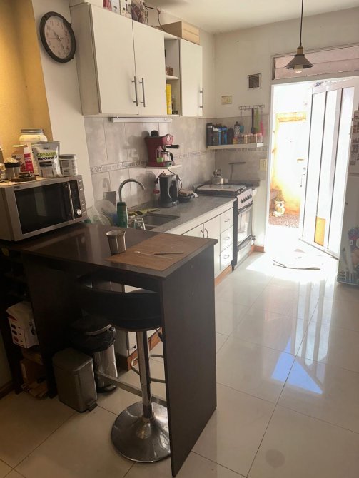 Ambiente integrado, Living - comedor amplio comunicado a la cocina por desayunador en madera. Amoblamientos de bajo mesada y alacena en madera enchapada. Piso de porcelanato.