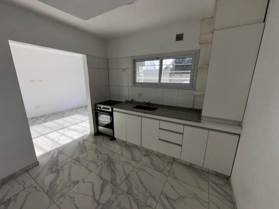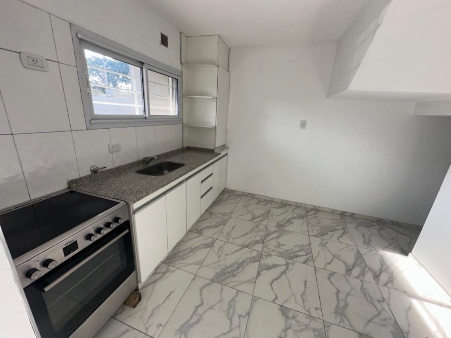Cocina independiente con amoblamientos de bajo mesada en madera enchapada. Artefacto de cocina y termotanque. Conexión para lavarropas automático.-