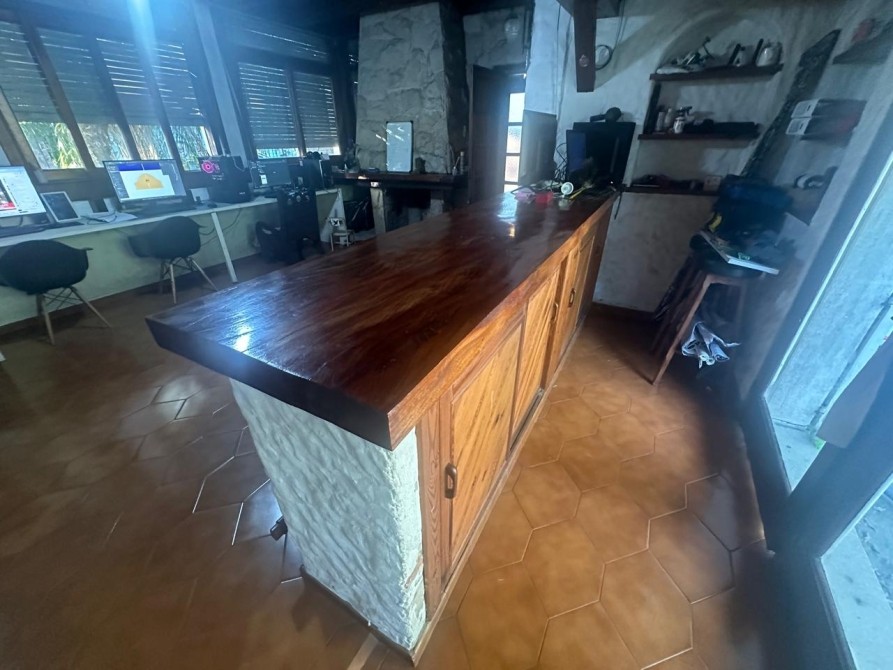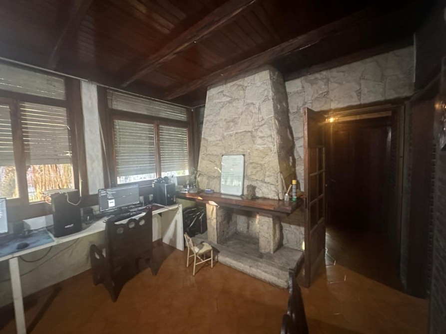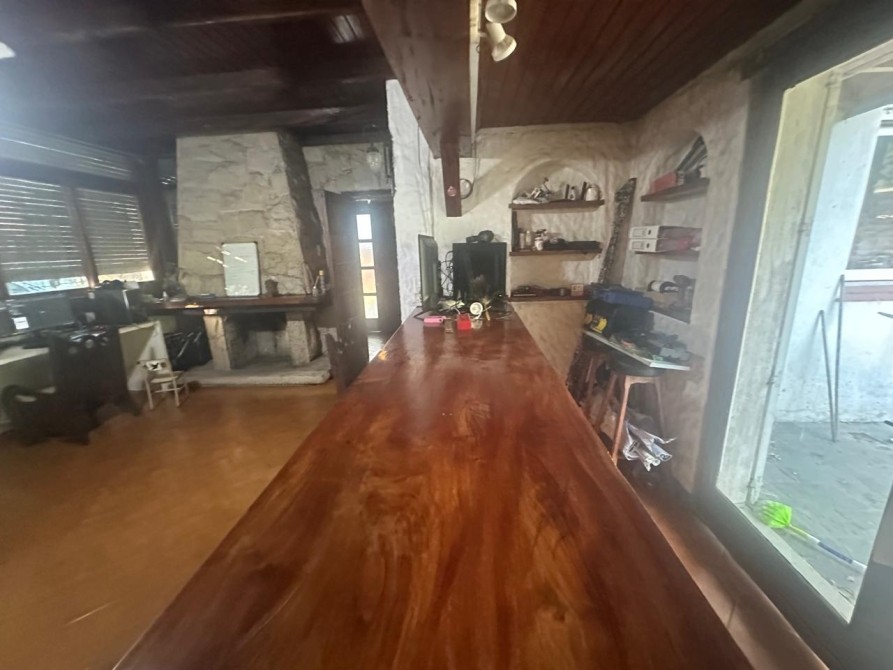 Living - Comedor muy amplio (ocupa todo el frente) con piso de de cerámica; Hogar a leña. Ventanas en madera con persina y rejas y ventana balcón de 3 hojas con postigos. Barra en madera con mueble de bajo mesada. Puerta balcón en madera con vista al parque.-